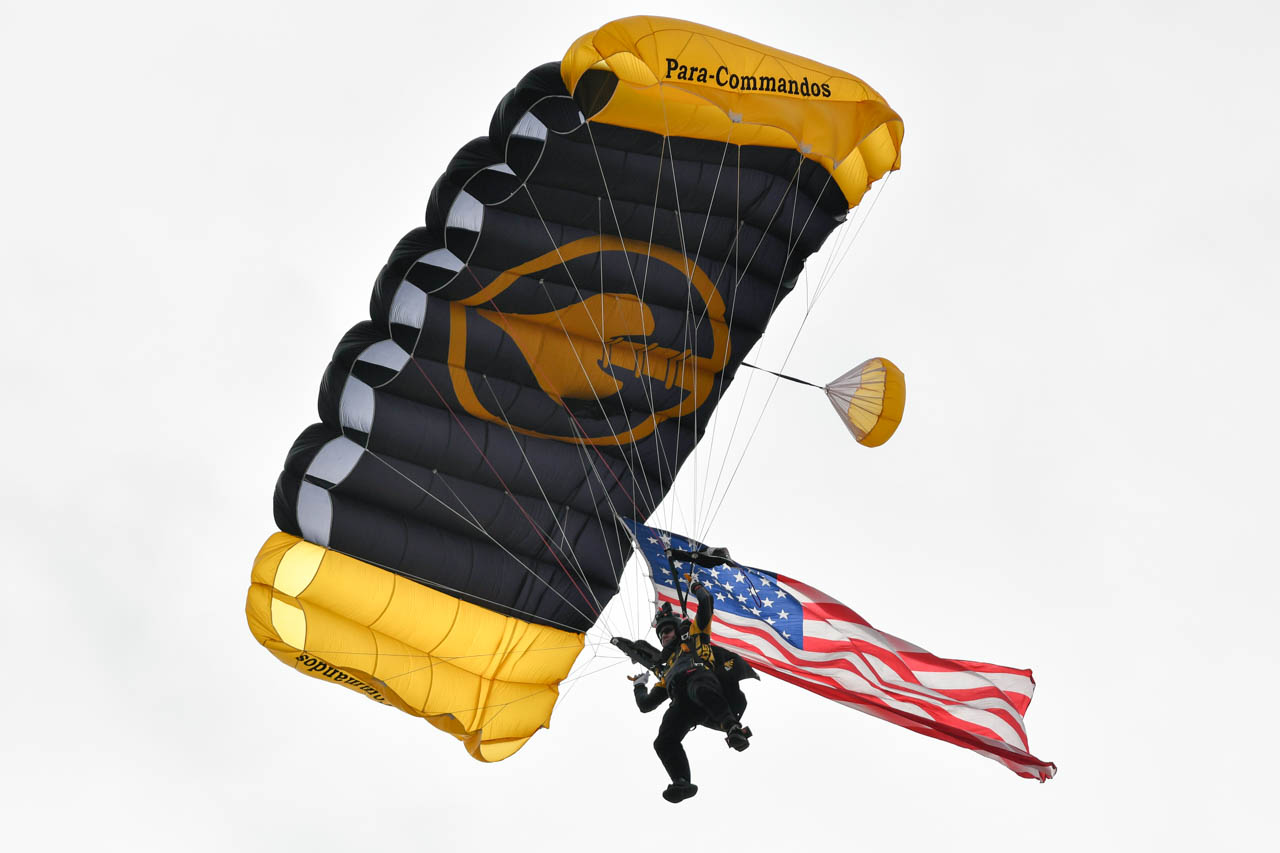 The SOCOM Para-Commandos parachuted into the stadium to deliver the game balls as part of the events planned to honor service members. Photo by HG Biggs.