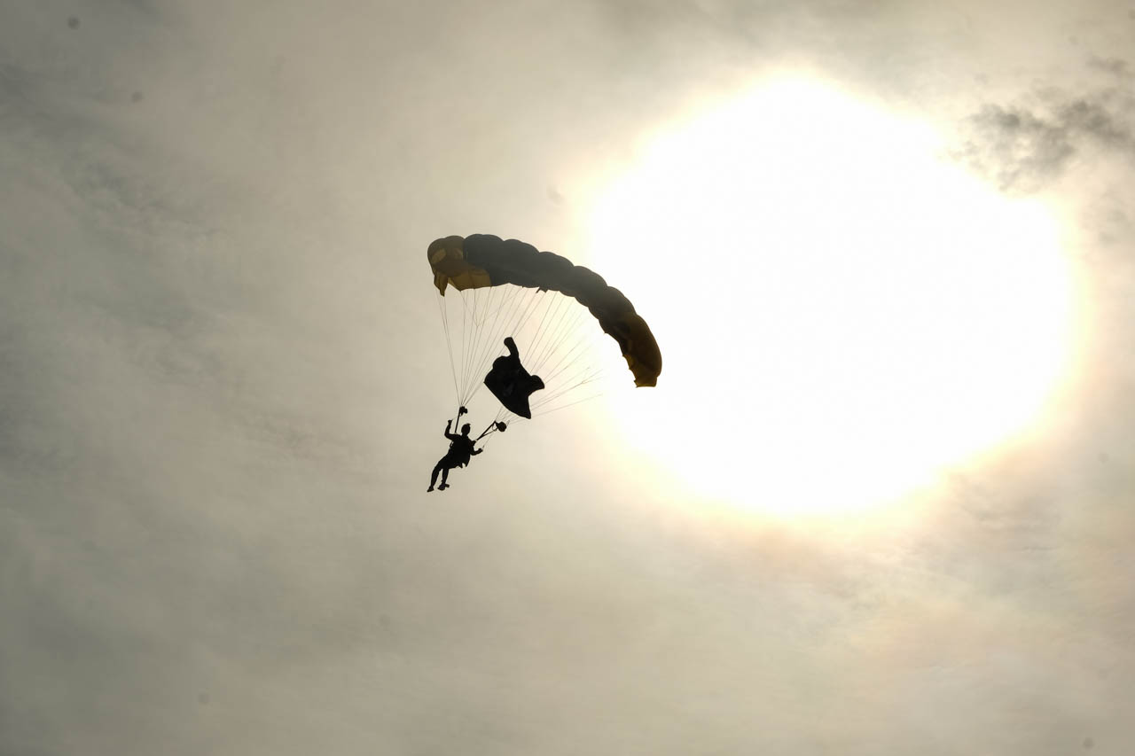 One of the SOCOM Para-Commandos flies past the sun on his way into Vaught-Hemingway Stadium. Photo by HG Biggs.
