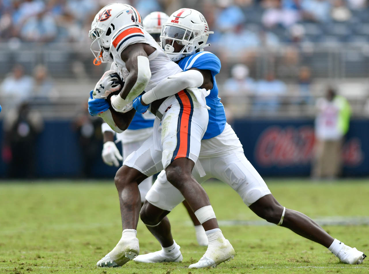 Ole Miss running back Zach Evans sticks Auburn cornerback Ja’varrius Johnson with a brutal stiff arm. Photo by HG Biggs.